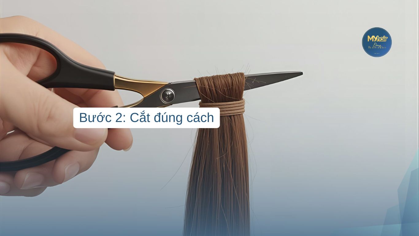 Khi cắt, hãy cắt theo hướng mọc tự nhiên của tóc. Đặt kéo song song với độ rũ của tóc, tránh cắt ngang tùy tiện. Hãy giữ chặt phần gốc tóc đã buộc, cắt phía dưới dây thun 1–2 cm để phần tóc không bị bung ra. Nếu tóc quá dày, hãy nhờ người thân hoặc thợ tóc giúp để các bó tóc được cắt đều, không lệch.